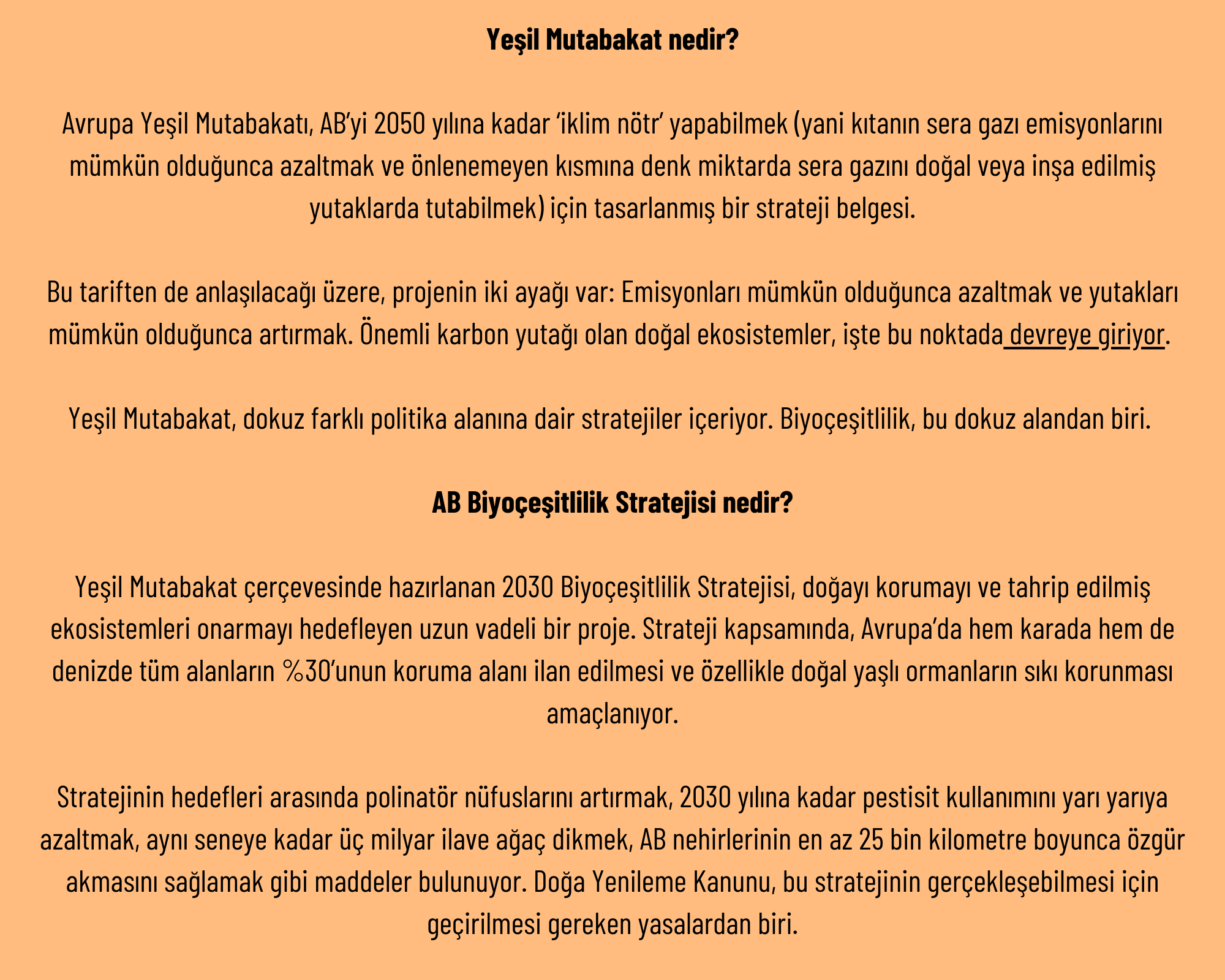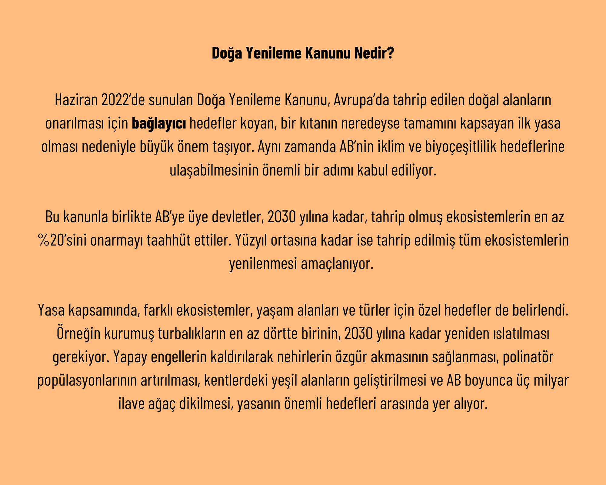 Avrupa Yeşil Mutabakatı ve AB Biyoçeşitlilik Stratejisi kapsamında hazırlanan bu kanun, hem biyoçeşitliliği artırmayı hem de iklim değişikliği ile mücadelede doğadan destek almayı hedefliyor. Nitekim Avrupa’da doğanın kaygı verici ölçüde zarar görmüş olduğu biliniyor. Kıtadaki yaşam alanlarının %80’den fazlasının iyi durumda olmadığı hesaplanıyor. Bu nedenle kıtanın sulak alanlarını, ormanlarını, nehirlerini ve denizlerini onarmak, doğayı restore etmek önem taşıyor.