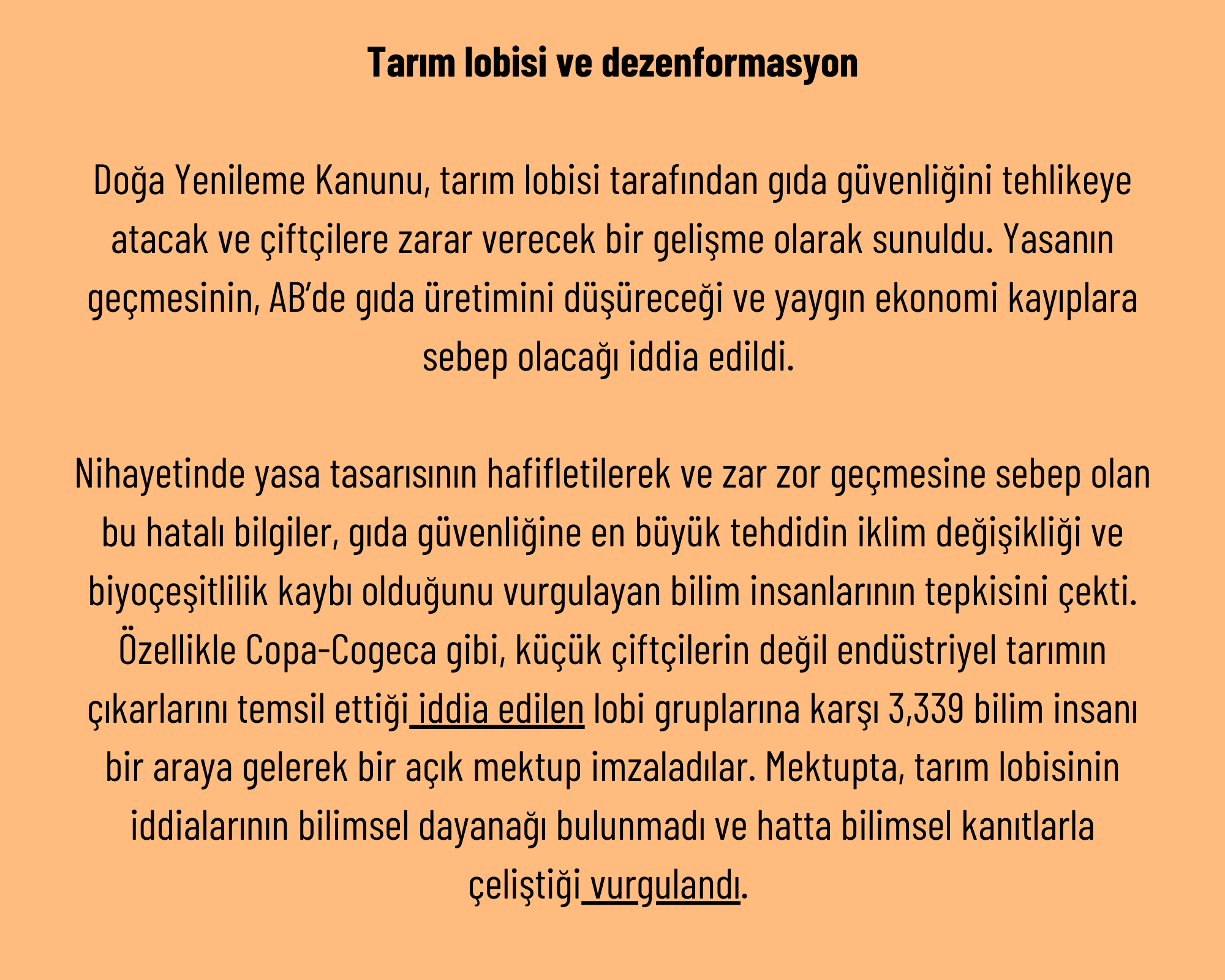 ‘’Doğa Yenileme Kanunu epey siyasileşti ve bunda da lobi faaliyetlerinin ciddi bir etkisi oldu. Örneğin Copa-Cogeca isimli büyük tarım lobisi, bu kanunun geçişini engellemek istiyordu. Ve tabii ki parası, zamanı ve lobicilik tecrübesi vardı. Dolayısıyla bazı hedeflerin düşürülmesinde etkili oldular.’’
