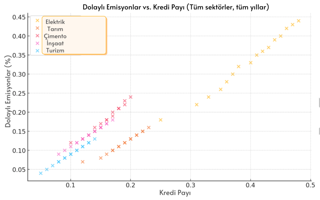 Bu grafikte, çeşitli sektörlerin dolaylı emisyonlarının (% olarak dikey eksende) kredi payı (% olarak yatay eksende) ile ilişkisi incelenmiştir. Görüldüğü üzere, sektörlerin dolaylı emisyonları ile kredi payı arasında genel olarak pozitif bir korelasyon bulunmaktadır. Yani, kredi payı arttıkça, dolaylı emisyon oranlarının da arttığı gözlemlenmektedir. Özellikle elektrik ve çimento gibi sektörlerde bu ilişki daha belirgin bir şekilde görülmektedir.
