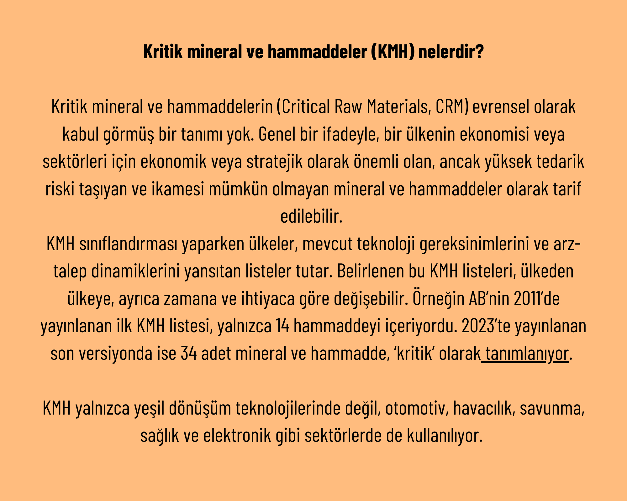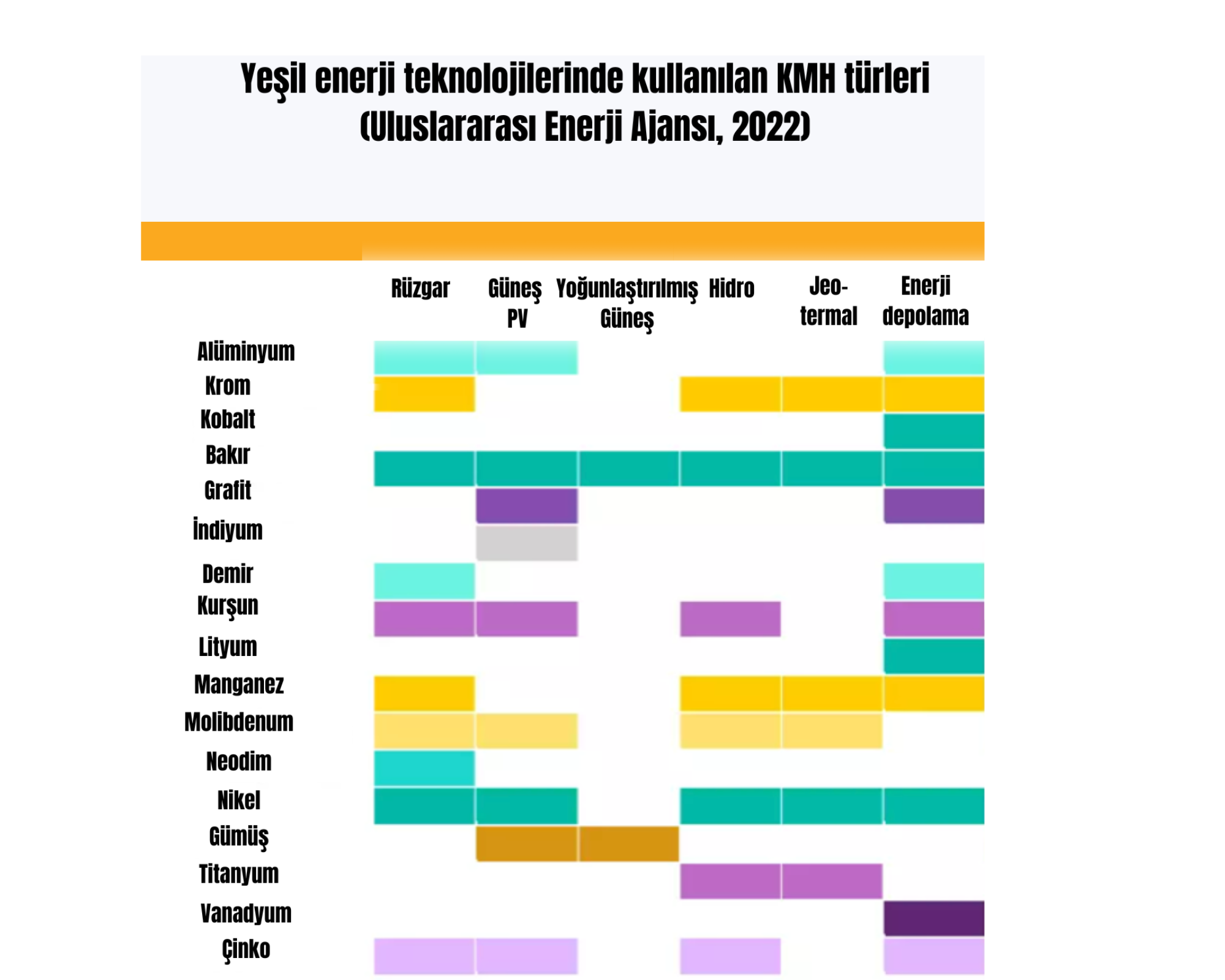 Enerji dönüşümü; demir-çelik, bakır ve alüminyum gibi standart malzemelerin yanı sıra KMH kullanımında da artış gerektiriyor. Dolayısıyla enerji dönüşümü perspektifinden bakıldığında bir mineralin veya hammaddenin ekonomik önemi, yeni yeşil teknolojiler üretmek için ne kadar gerekli olduğuna bağlı. Nitekim net sıfır hedeflerine ulaşmak, ancak güneş panelleri ve rüzgar türbinleri, elektrikli araçlar ya da enerji depolama pilleri gibi düşük karbonlu teknolojilerin geliştirilmesi ile mümkün olacak.