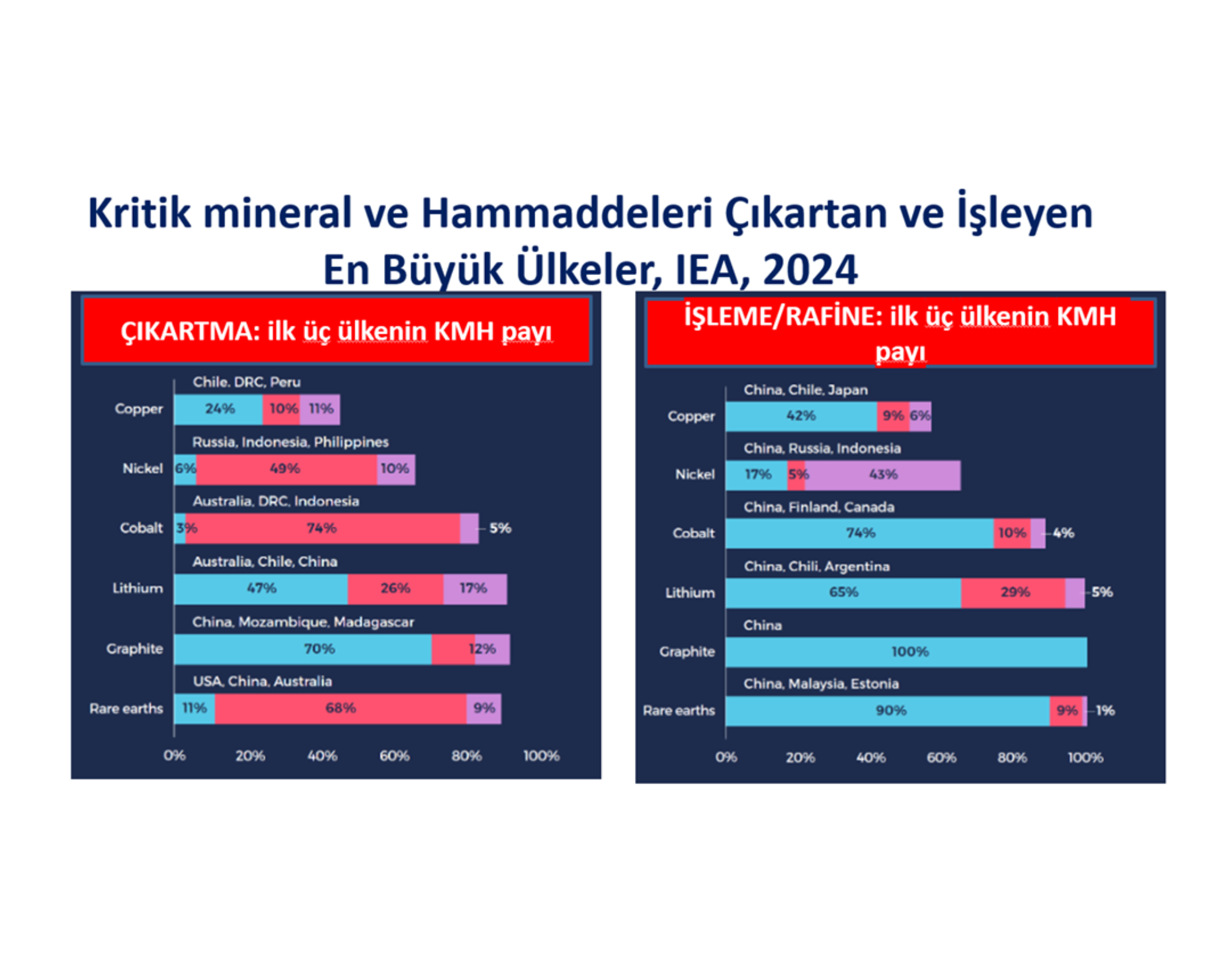 ‘’Kobaltın %74’ü tek başına Çin’de rafine ediliyor. Benzer şekilde, lityumun %65’i, nadir toprak elementlerinin %90’ı ve grafitin neredeyse tamamı, tek başına Çin’de işlenip rafine ediliyor.’’