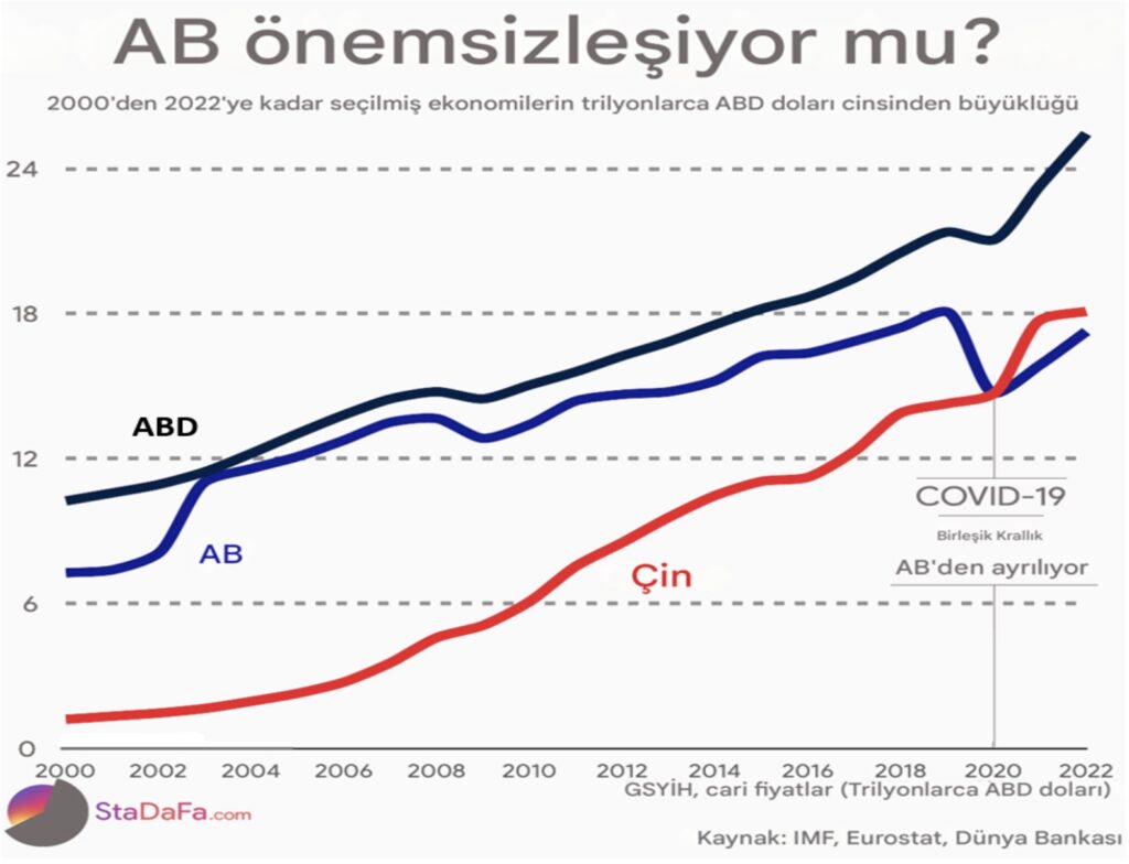 Aynı durum, Çin ile AB karşılaştırması yapıldığında daha da çarpıcı sonuçlar veriyor. Yeni Milenyumun başlangıcında Çin’in toplam GSYH’sı 1.21 trilyon dolardı ve bu değer, AB üyesi Almanya’nın 1.95 trilyon dolarlık GSYH’sından daha küçüktü. 2022 yılında ise Çin’in toplam GSYH değeri, 27 üyeli AB ekonomisinin toplamından daha fazla hale geldi.