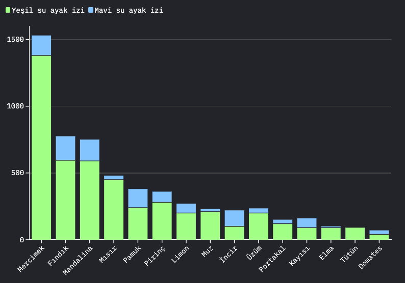 Tarım ürünlerinin su ayak izi dikkate alındığında, mercimek, fındık ve pamuk gibi ürünlerinin küresel su ayak izlerinin yüksek olduğu görülüyor. Fındık, pamuk ve incir ise mavi su ayak izi en yüksek ürünler olarak öne çıkıyor. Mavi su ayak izinin yüksek olması, bu ürünlerin üretiminde daha fazla sulama suyuna ihtiyaç duyulduğu anlamına geliyor.